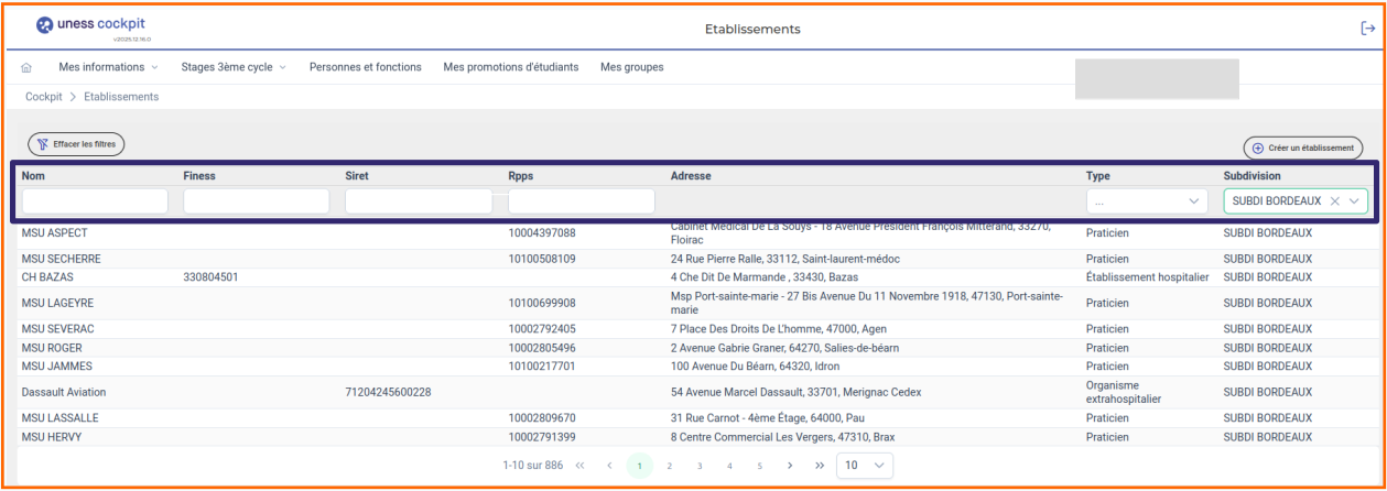 L'utilisateur est redirigé sur la liste des établissements de son périmètre.Rechercher un établissement en particulier