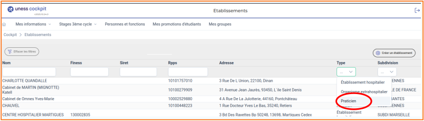 - « praticien », identifié par un numéro RPPS.Consulter la liste des établissements de sa subdivision