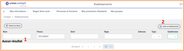 Possibilité de filtrer par nom, numéro (finess, rpps, siret) ou type d'établissement.Création d'un établissement