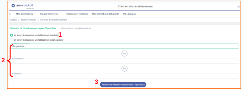 • Sélectionner le type d’établissement : hospitalier ou extra-hospitalier (1) ;