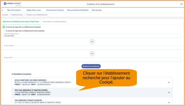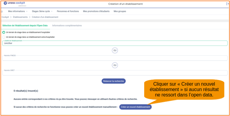 • Il est possible qu’une recherche d’établissement n’aboutisse pas et que pour diverses raison, l’établissement ne soit pas connu du Cockpit ("Aucun résultat") ;