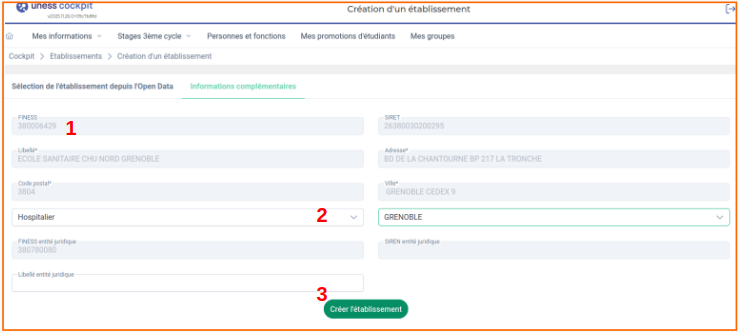 • Un message confirme que le nouvel établissement a bien été créé (2).Création d'un établissement hors-open data