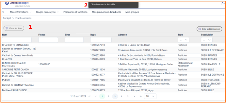 • L’utilisateur est redirigé vers la liste des établissements (1) ;