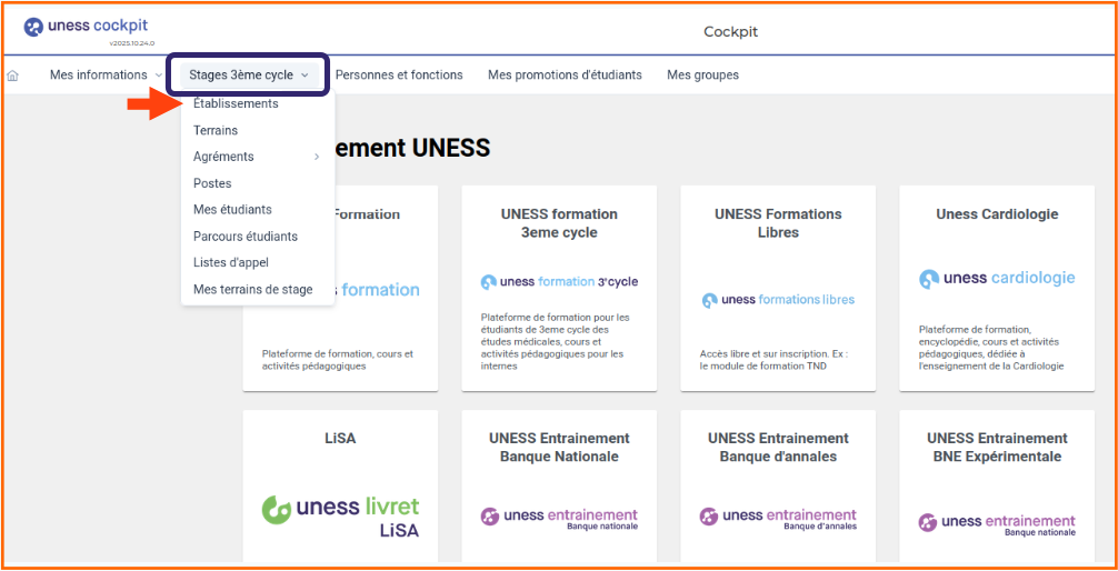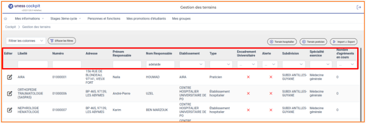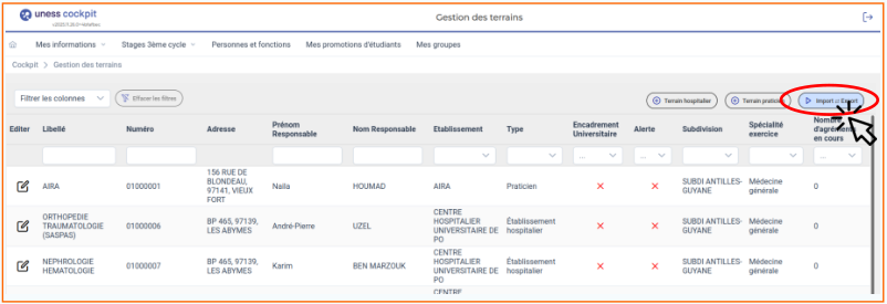 Dans sa forme actuelle, le Cockpit est l'interface principale des gestionnaires ARS et Scolarité. Il permet de gérer les données sur les terrains de stages, les étudiants et les stages.