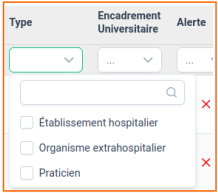 Dans SiiMOP, les terrains sont répartis en trois types selon l'établissement auquel ils sont reliés : hospitalier, extra-hospitalier ou praticien :