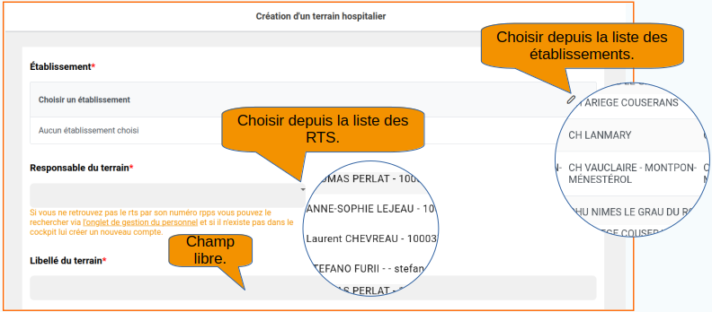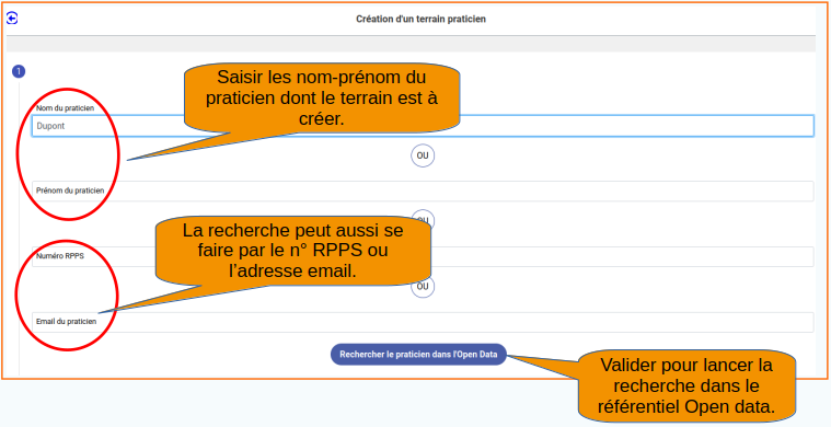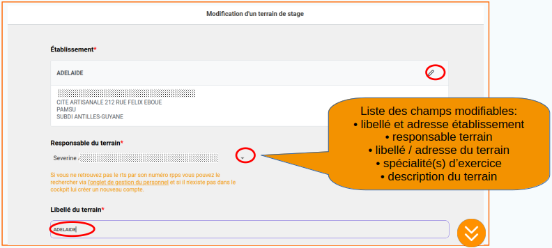 • La création d’un établissement praticien se fait depuis la page Terrains (cf tutoriel)Cas-limite 2 : mise à jour des données "établissement"