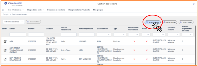 Depuis l’onglet “Terrains”, cliquer sur le bouton “Terrain hospitalier” :