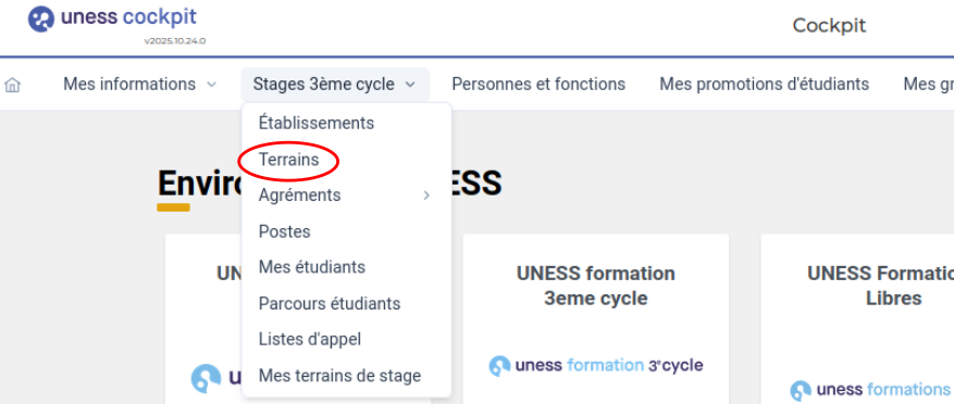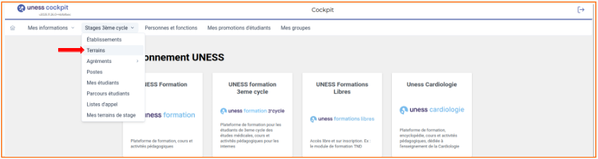 Depuis la page d’accueil du Cockpit, sélectionner “Terrains” dans l’onglet “Stages 3° cycle” :