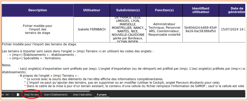 • La feuille “(imp) Terrains” propose un fichier listant les terrains au format réimportable (2) :