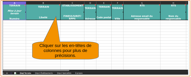 Dans le cas d’une mise à jour de terrains existants, renseigner la colonne A puis uniquement les colonnes à modifier :