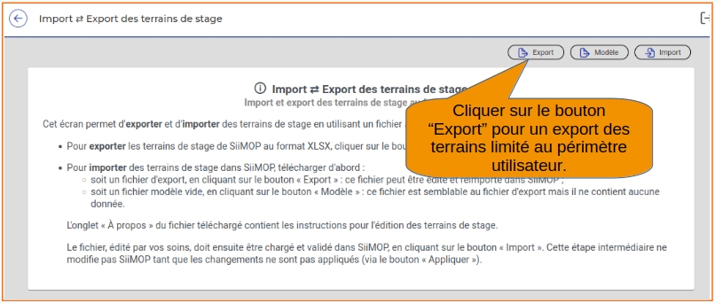 • Un export de la liste des établissements est disponible depuis l’onglet Terrains du Cockpit, feuillet Établissements ;