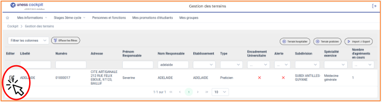 Cliquer sur l’icône d’édition pour accéder au détail du terrain de stage :