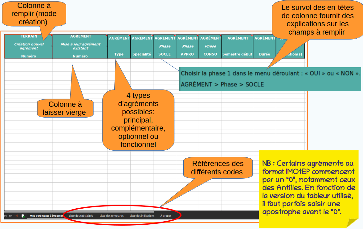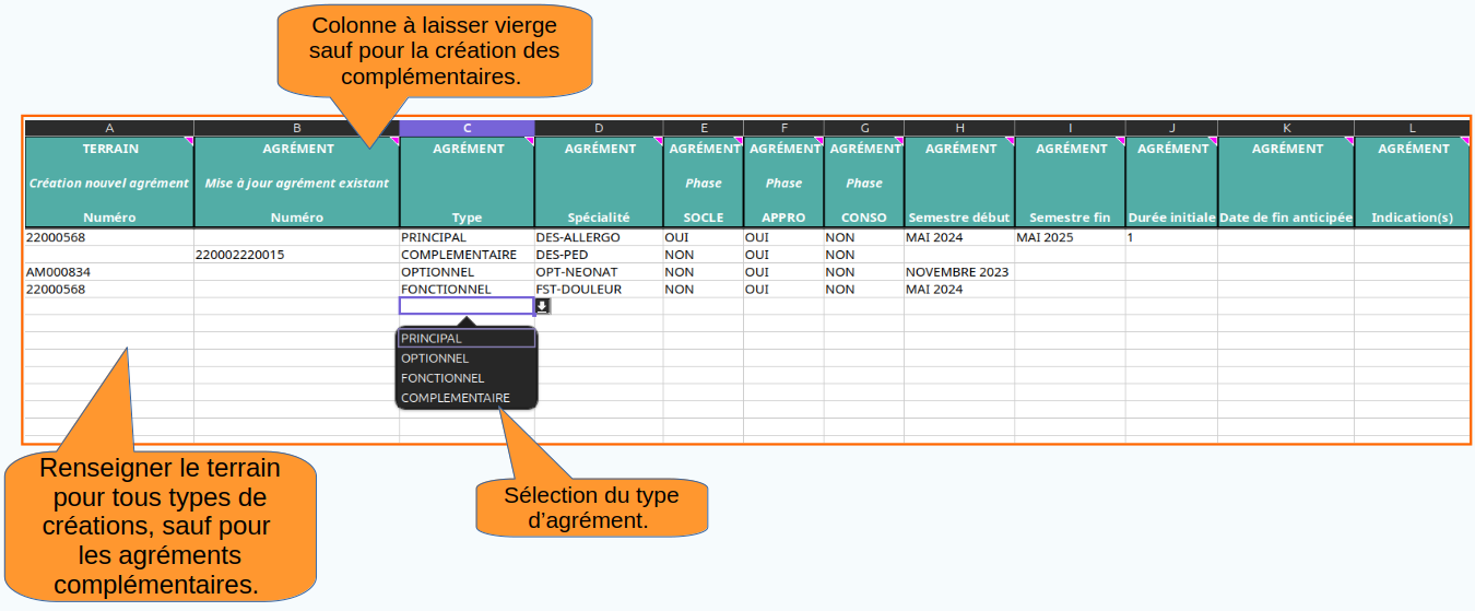 • 4 types d'agrément =principal, optionnel, fonctionnel ou complémentaire (colonne C)