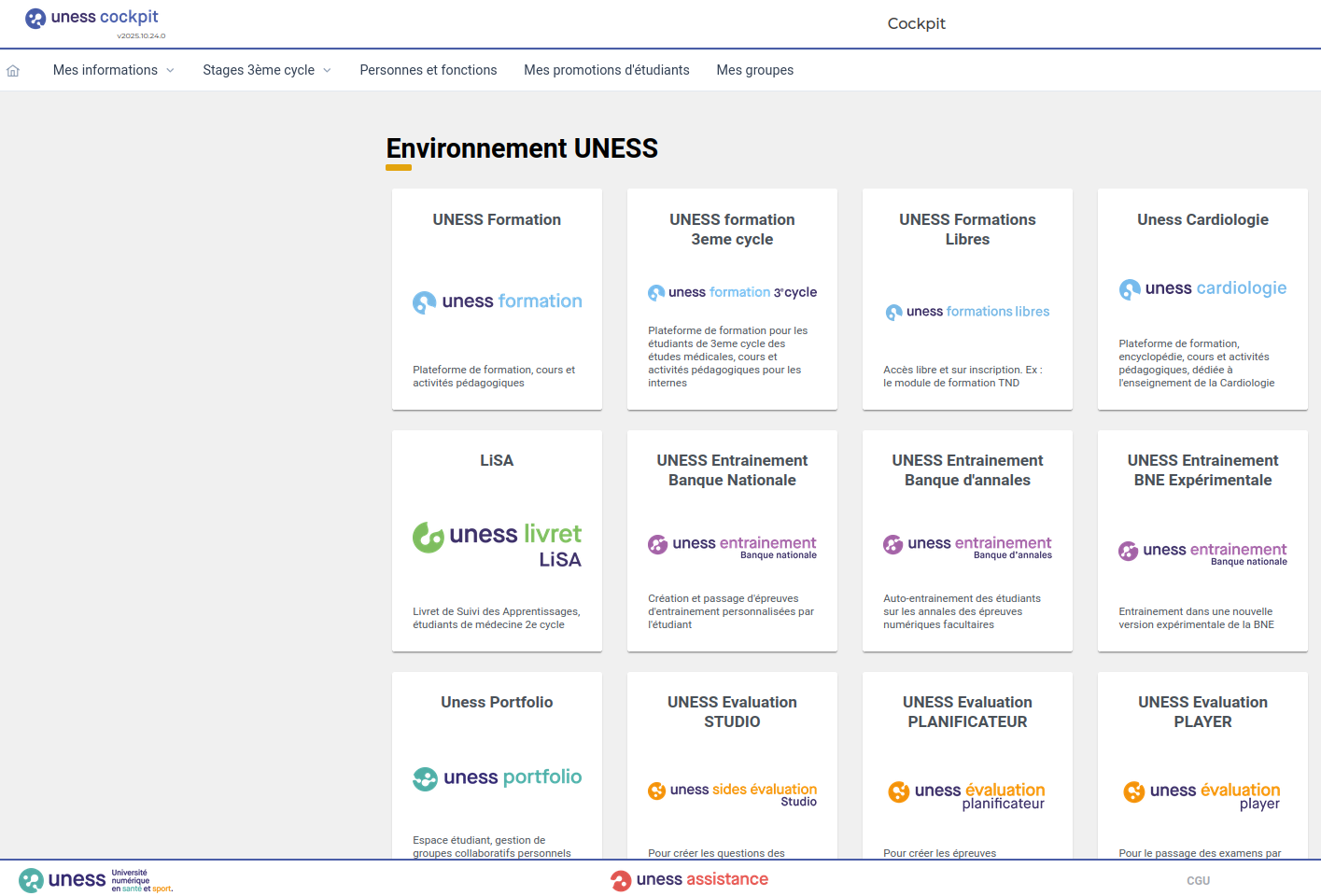 Dans sa forme actuelle, le Cockpit est l'interface principale des gestionnaires ARS et Scolarité. Il permet de gérer les données sur les terrains de stages, les étudiants et les stages.