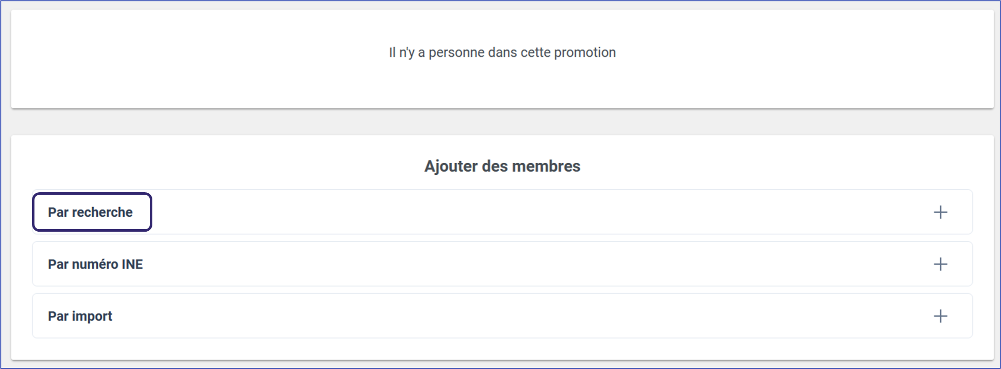 1. Apparaissent les encart « Membres » et « Ajouter des membres ». Votre promotion est pour l’instant vide. Dans « Ajouter des membres », cliquer sur « Par recherche »
