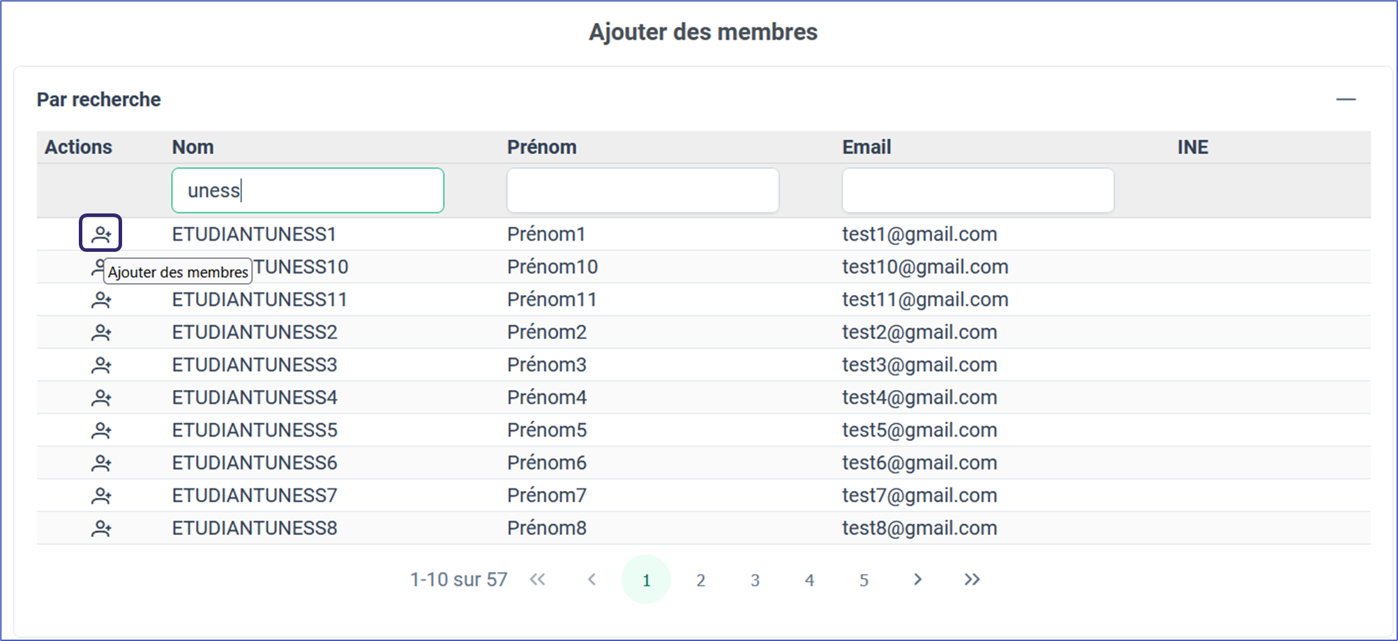 2. Chercher les étudiants à inscrire par le Nom, Prénom et mail. Taper sur « Entrée » pour rechercher et sur le filtre pour effacer sa recherche. Cliquer sur "ajouter des membres"
