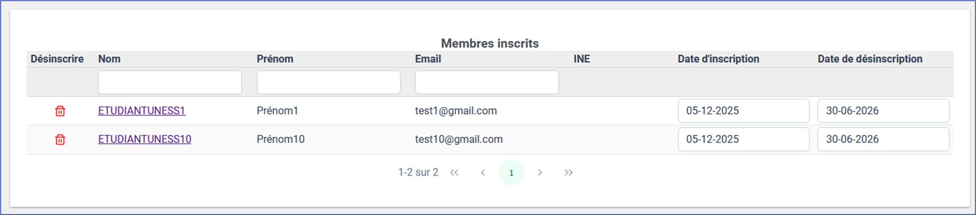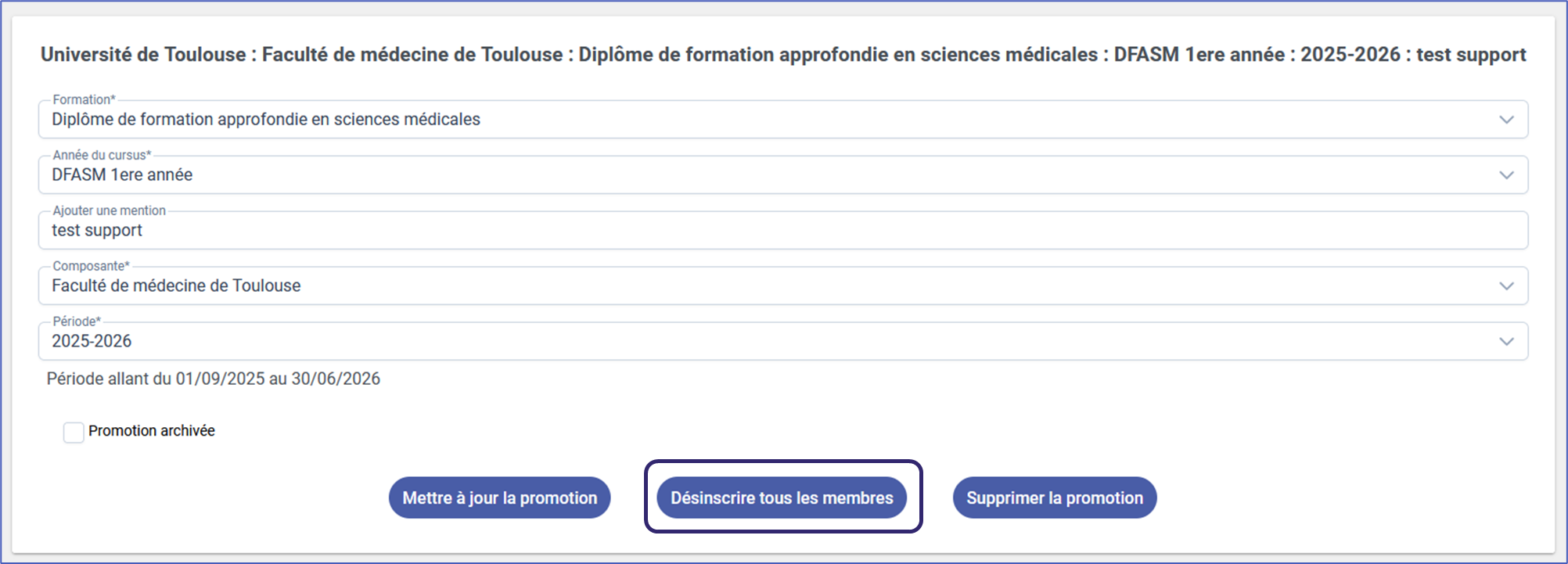 3. Les étudiants sont automatiquement ajouté à la promotion et apparaissent dans le tableau "membres inscrits", avec une date de début et fin d'inscription. Dans l'encart des informations de la promotion apparait le bouton "Désinscrire tous les membres". Cette option est disponible uniquement le premier jour d'ajout dans la promotion, pour supprimer en masse les membres qu'on aurait pu inscrire par erreur.