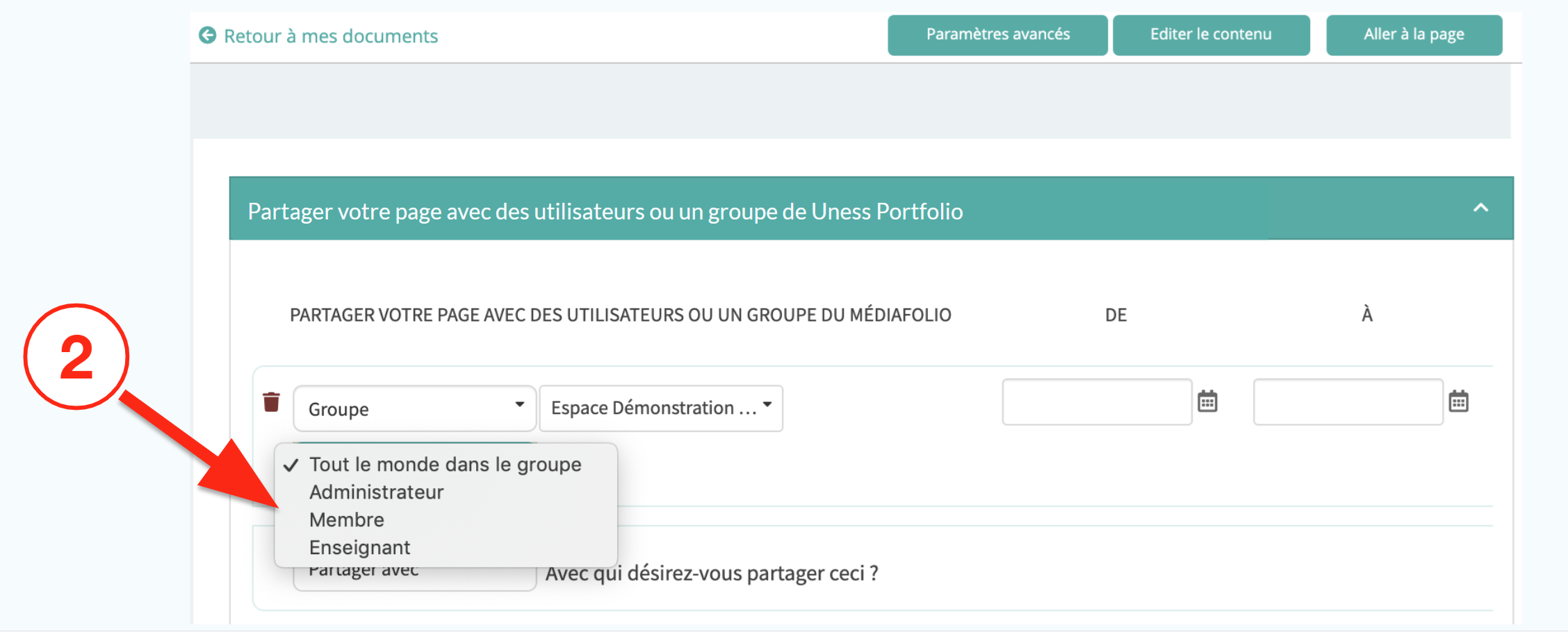 1. En ouvrant le menu déroulant, vous pouvez choisir qui dans le groupe pourra accéder à la page.