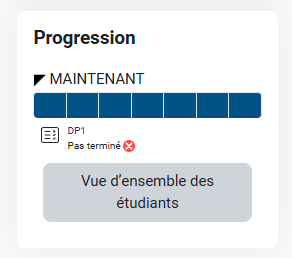 Pour suivre la progression des étudiants, cliquer sur « vue d’ensemble des étudiants » dans le bloc « progression ». Vous aurez accès à l’avancée dans l’épreuve de chaque étudiant.