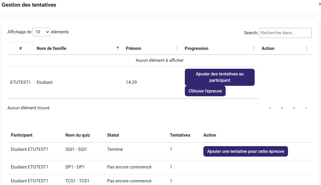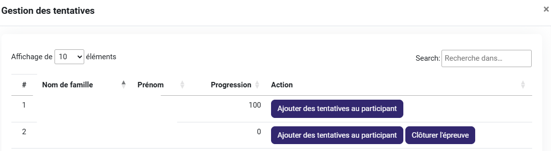 1. Dans « gestion des tentatives », vous pouvez ajouter des tentatives au participant en cliquant sur "Ajouter des tentatives au participant" puis sur « ajouter une tentative pour cette épreuve »