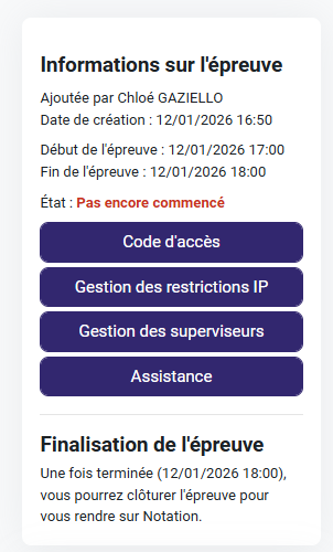1. Une fois dans l’épreuve, vous accédez, si vous êtes bien superviseur, au bloc de supervision propre à ce statut. Lorsque l’épreuve n’a pas encore démarré vous avez accès à :