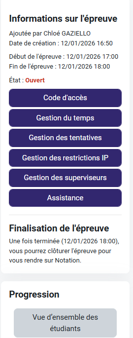 Attention ! L'heure de fin d'épreuve ne se met à jour qu'une fois que l'étudiant a commencé l'épreuve, c'est à dire a commencé une tentative. Pensez à actualiser les informations du bloc en rechargeant la page.