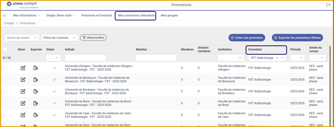 3. Filtrer sur sur tous les autres champs pour rechercher la promotion à peupler :