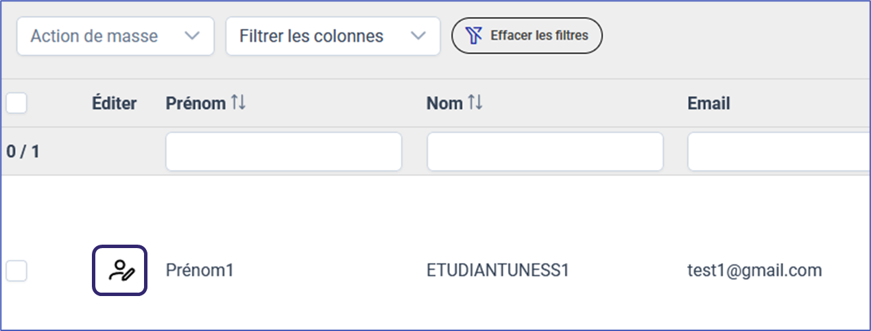 1. Pour ajouter un utilisateur à une promotion existante, rechercher l’utilisateur dans le menu « Personnes et fonctions » puis cliquer sur « éditer » en face de l’utilisateur concerné :
