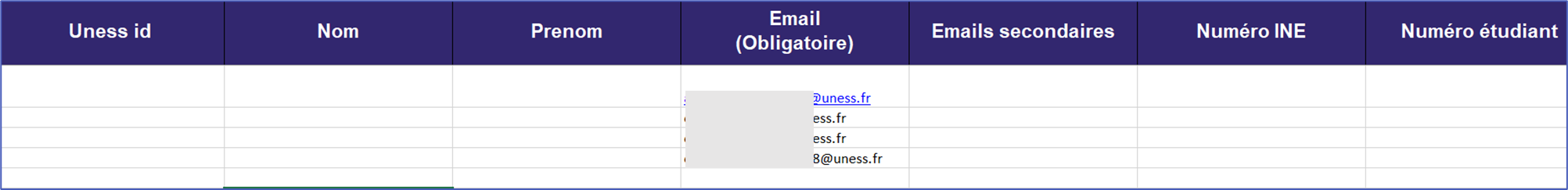 Lors de cet import par fichier, vous pouvez à la fois créer des comptes pour les étudiants ou mettre à jour des comptes, et ajouter les étudiants à la promotion. Aussi, lorsque vous souhaitez créer les comptes, il est indispensable de compléter le fichier d'import avec au moins le nom, prénom et mail de l'étudiant. Lorsque les comptes sont existants dans le système et que vous souhaitez simplement ajouter les étudiants à la promotion, seul le mail est indispensable.