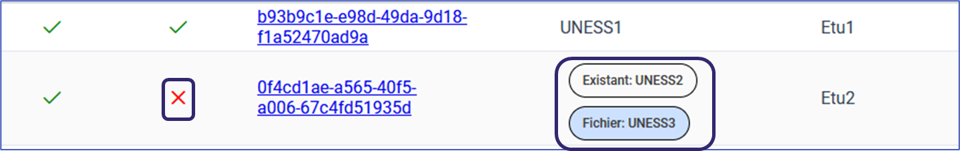 si toutes les données renseignées permettent l'inscription directe dans la promotion, la création ou la mise à jour. En cas de conflit de données, par exemple lorsqu'on souhaite mettre à jour le nom de l'étudiant, le statut des données pour cet étudiant sera en "erreur"