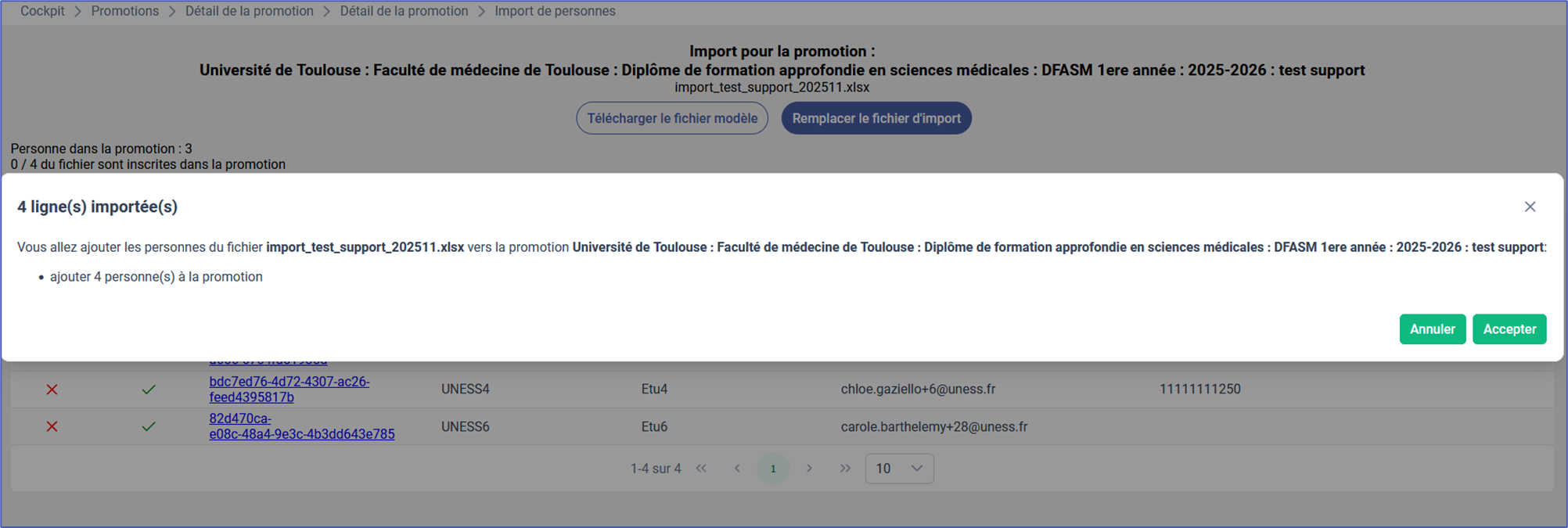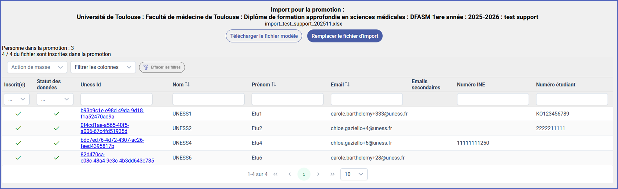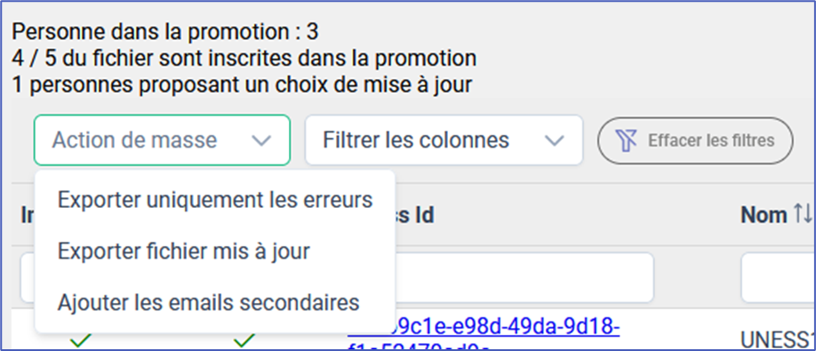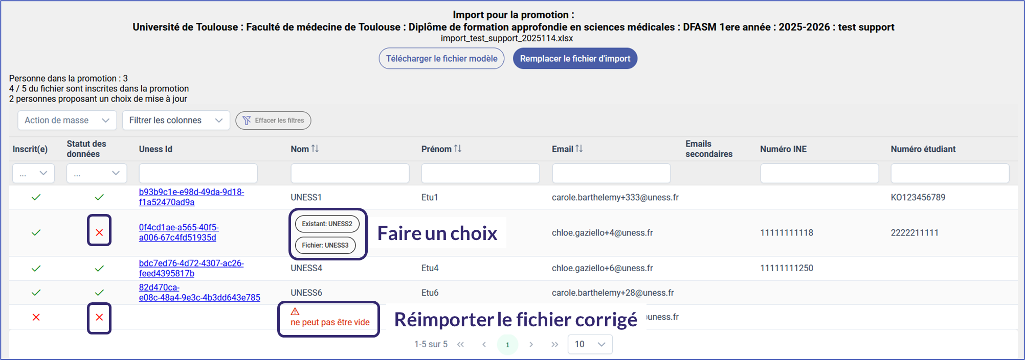 sont automatiquement inscrits en tant que membres de la promotion. Corriger les lignes en "erreurs" pour mettre à jour ou ajouter tous les étudiants du fichier à la promotion