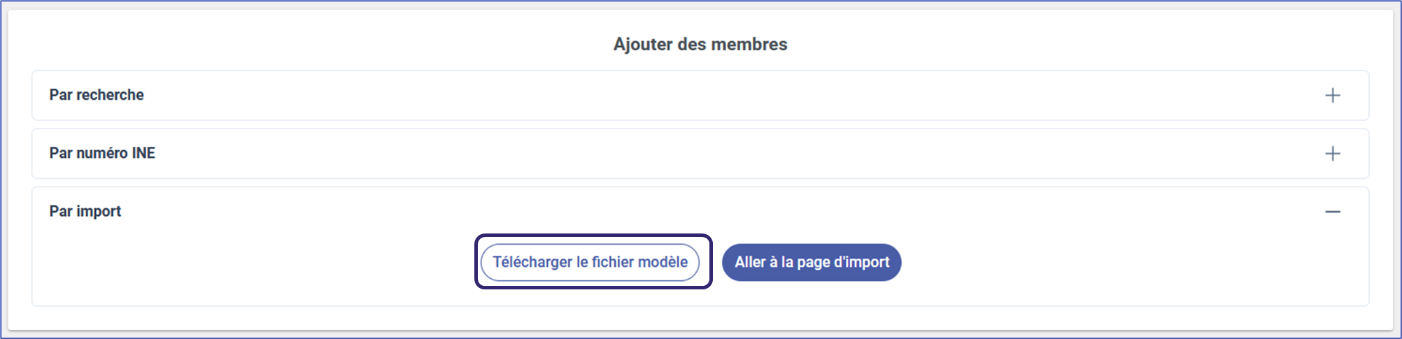 1. Pour ajouter des étudiants à la promotion par fichier d’import, dans « Ajouter des membres », « par fichier d’import» cliquer sur « télécharger le fichier modèle »