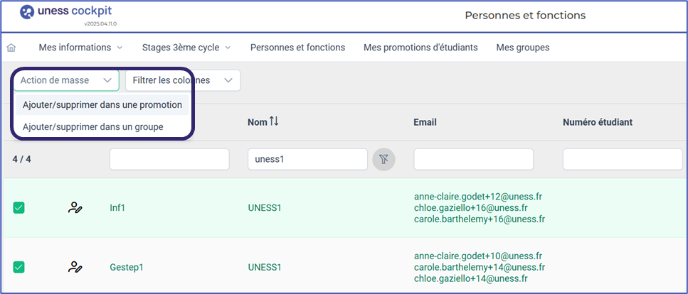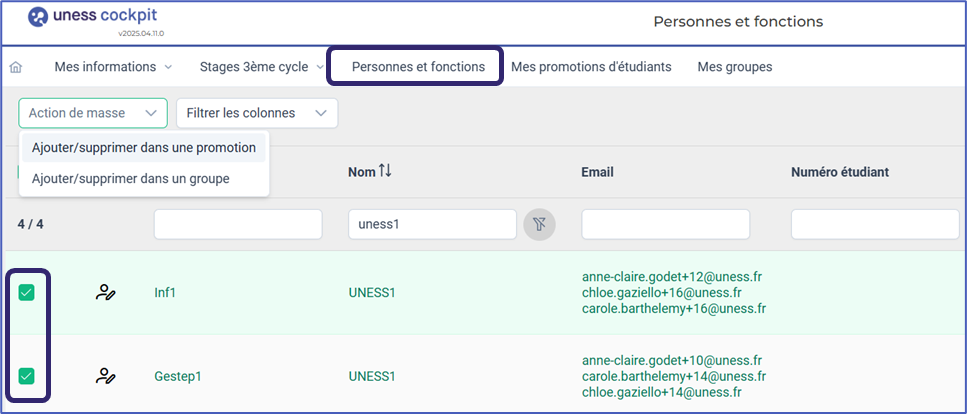 1.Dans le menu « Personnes et fonctions », rechercher les étudiants par leur mail