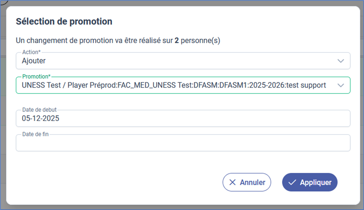 4.Dans la fenêtre « sélection de promotion », choisir « ajouter » ou « supprimer » dans une promotion, sélectionner la promotion dans le menu déroulant, indiquer la date d’effet et cliquer sur « Appliquer ».