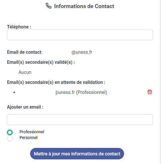 En cas d'erreur, il est possible de supprimer ce mail secondaire en cliquant sur la poubelle.