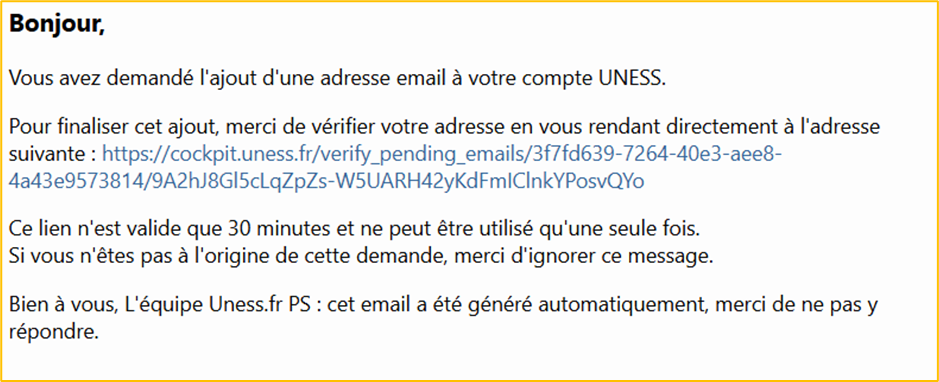 Un lien est envoyé pour valider dans le mail secondaire (celui qui vient d'être ajouté) :