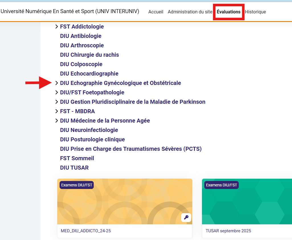 2. Cliquez sur le lien vers l'épreuve concernée ou suivez le chemin depuis Évaluations - puis cliquez sur la catégorie concernée puis sur l'épreuve.