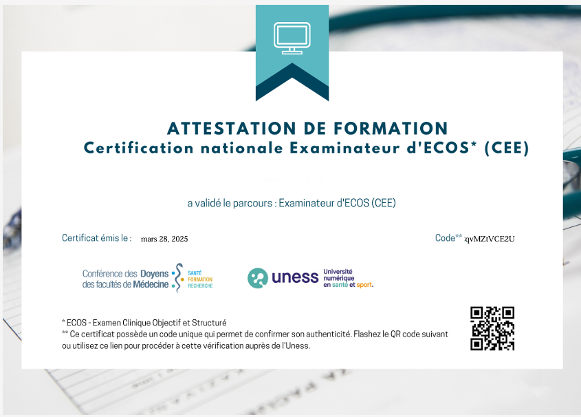 Pour être évaluateur d'ECOS, une formation est disponible sur Uness formation : lien vers la formation Certification examinateur d'ECOS