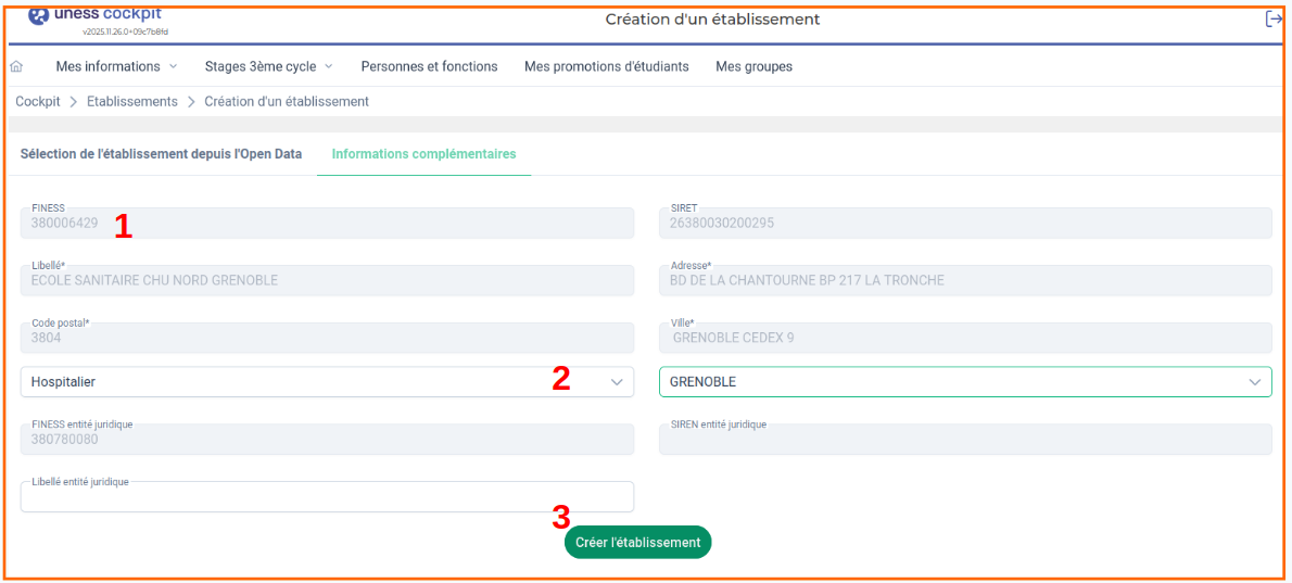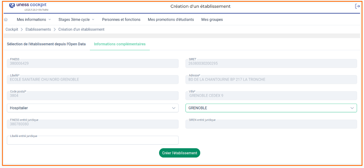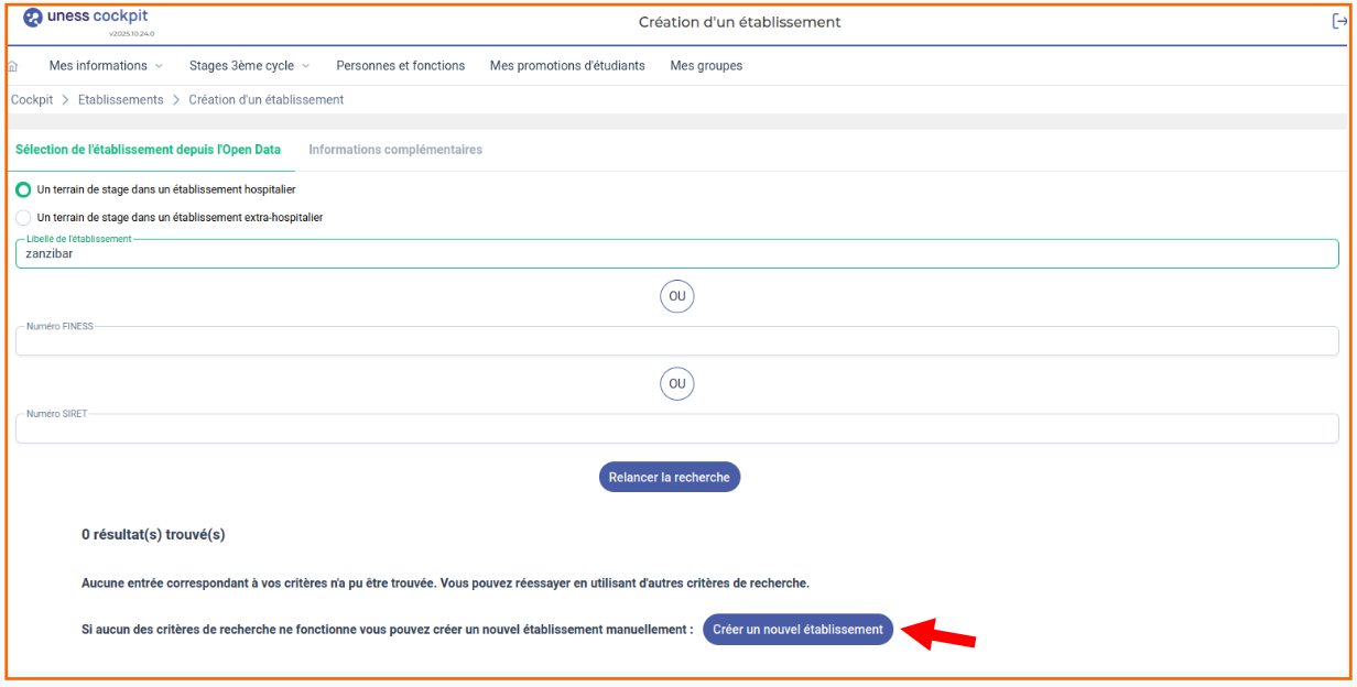 Si aucun résultat ne ressort dans l'open data, cliquer sur le bouton "Créer un nouvel établissement" :