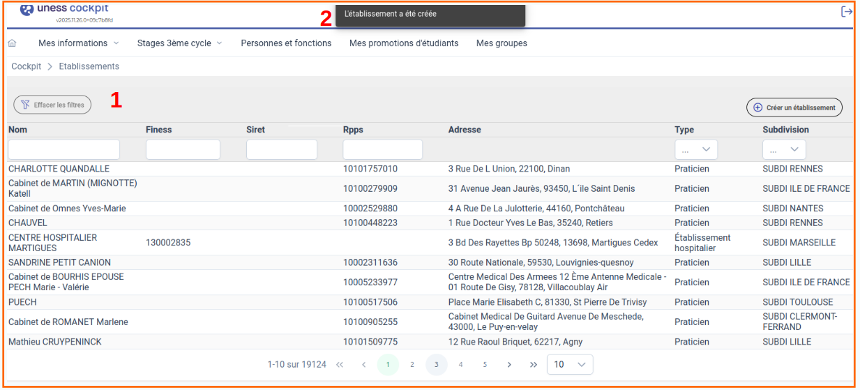 • L’utilisateur est redirigé vers la liste des établissements (1) ;