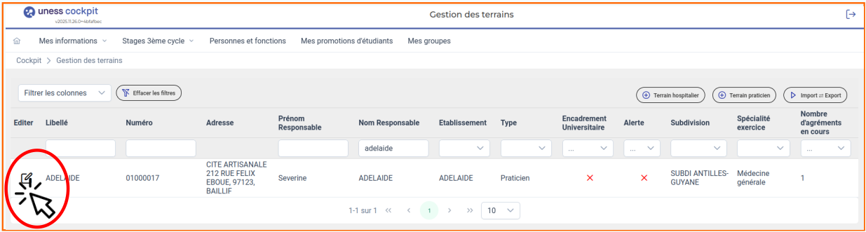 Cliquer sur l’icône d’édition pour accéder au détail du terrain de stage: