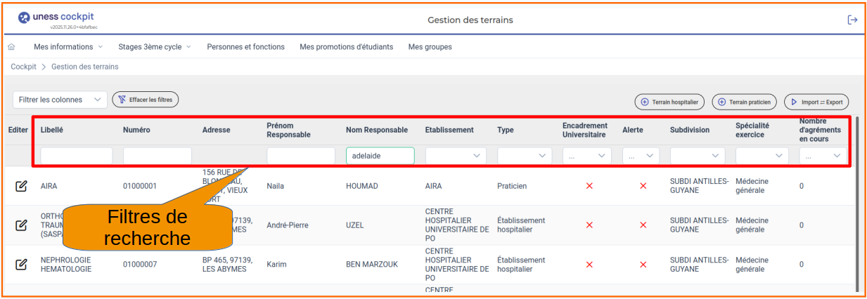 Depuis l’onglet “Terrains”, saisir un terme de recherche dans un ou plusieurs filtres (type d’établissement, spécialité, statut des agréments...) :