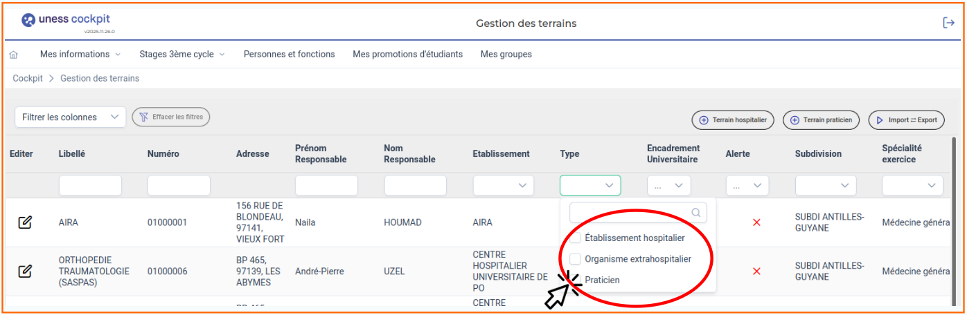 Possibilité de filtrer uniquement sur un type de terrain (hospitalier, praticien ou extra-hospitalier) :